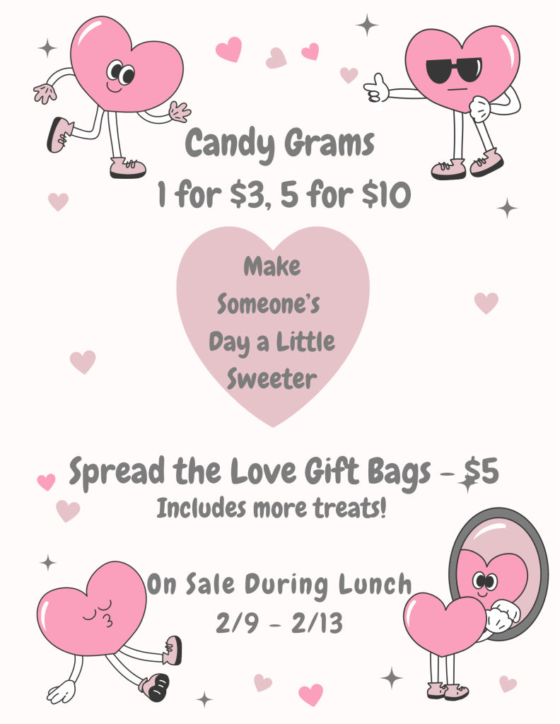 ¡Nuestras celebraciones de San Valentín se acercan! Estaremos organizando un Baile de San Valentín y vendiendo Candygrams como recaudaciones de fondos para apoyar las actividades de 8.º y 6.º grado, y estamos solicitando donaciones para que estos eventos sean un éxito. Las familias pueden inscribirse en SignUpGenius para donar artículos específicos, y algunos artículos también están disponibles en las Listas de Amazon que aparecen a continuación. Las donaciones también pueden entregarse en la oficina de la escuela del 26 al 30 de enero.