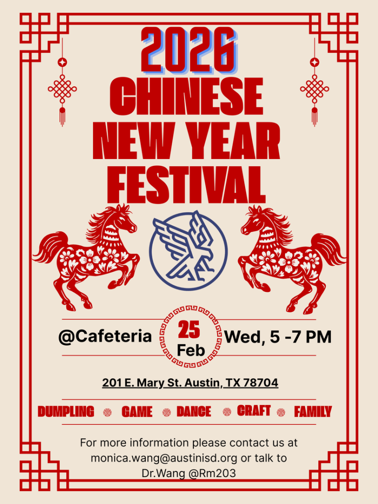 ¡Celebremos el Año del Caballo! Acompáñenos al Festival de Año Nuevo Chino de Lively, con actividades culturales, espectáculos y diversión para toda la familia. ¡Todos los estudiantes, familias y miembros de la comunidad están invitados! La escuela necesita voluntarios adultos (profesores or padres de familia) para apoyar a los estudiantes que están organizando las actividades.